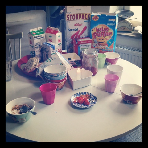 Jahapp, idag har jag ätit frukost till frukost och till middag och glömt bort lunchen. Kommit 1,5 timme försent med barnet till förskolan, fikat gott hos god vän, kommit hem och rensat hela förrådet (kors i taket lilleman sov gott i vagnen 2,5 timme), trott att det är torsdag och sagt att "Nu tar ju vi helg" till förskolepersonalen "Trevlig helg!" tagit med mig dotra och gått hem.., forslat dotra till staden för några dagars vistelse hos kär faster gör pappan i detta nu (som är vaken och numera ledig ett tag.) Strax ska vi på spontanfirande av väns nystart av Enskild firma, Alltid trevligt med spontant.
